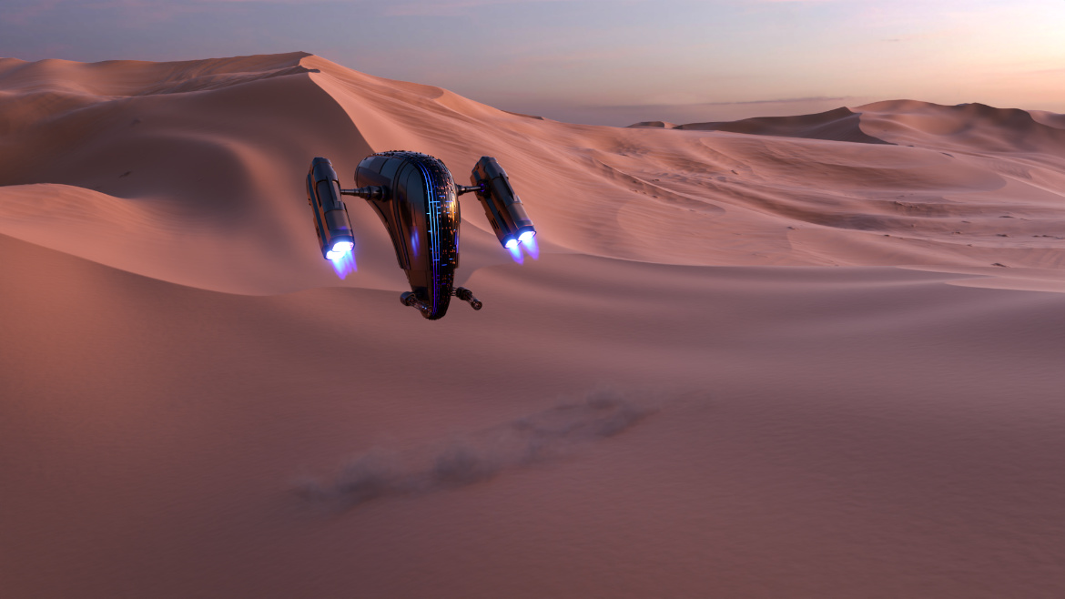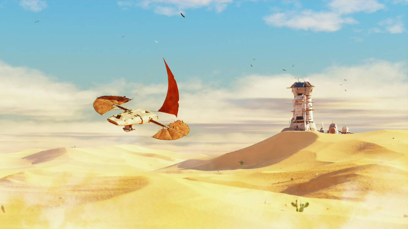 La scène vous transporte dans un paysage infini, où le sable doré s'étend à perte de vue, illuminé par les rayons d'un soleil implacable. Le planeur, à la fois élégant et fonctionnel, évoque l'aventure et l'exploration dans un univers lointain. l'immensité d'un monde désertique et abandonné vous invitant à vous perdre dans l'atmosphère immersive de ce monde désertique, entre passé mystique et futur incertain.