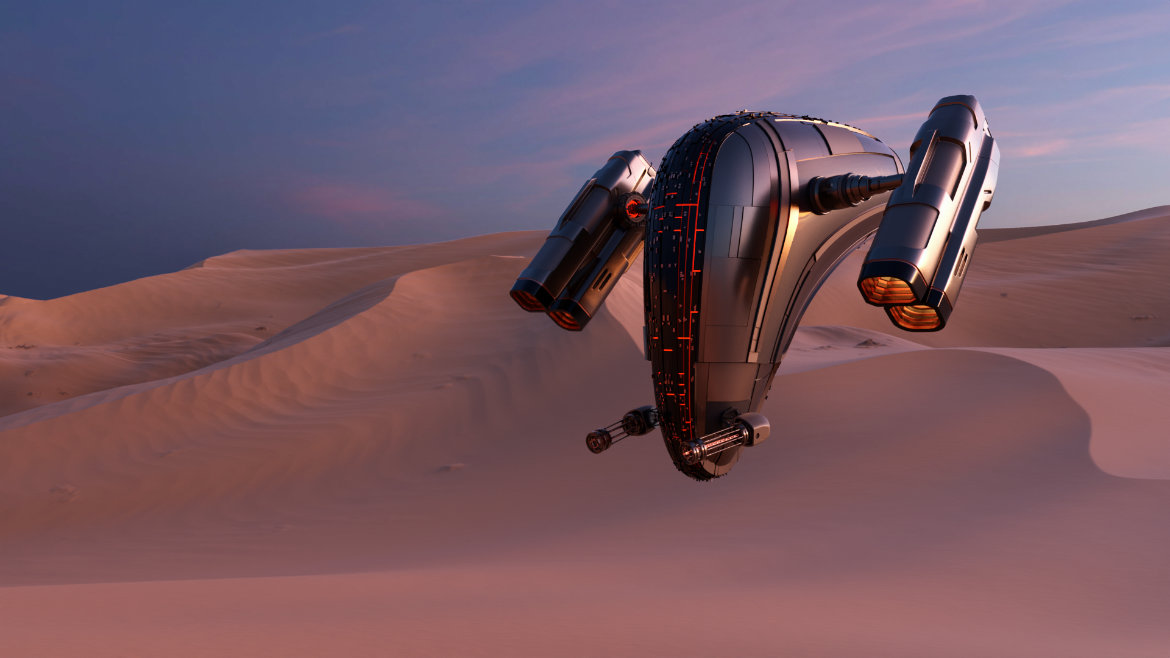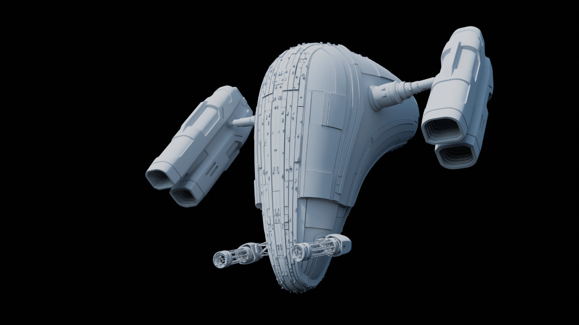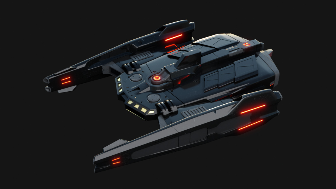 Son nom fait référence au nom latin “SPY”, qui signifie : Un Espion/Patrouilleur. Ce vaisseau, conçu pour notre projet Reminiscence, a un rôle de patrouilleur avec armement léger. C’est un gardien de la planète, il n’interviendra pas dans l’espace. Pour la petite anecdote : Le procédé le plus fastidieux dans cette création, est l’effet de fumée et de la poussière, ainsi que la génération des dunes, un environnement type désert.