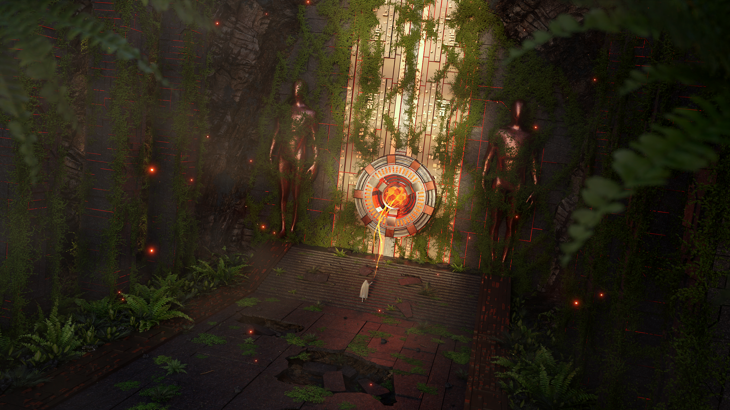 Au cœur d'une jungle luxuriante, les ruines d'un temple oublié se dressent vers le ciel. Le temps et la végétation ont envahi ce lieu sacré, transformant les murs de pierre en une mosaïque de mousse et de lierre. Les arbres géants projettent leurs ombres sur le sol, créant une atmosphère mystérieuse et oppressante. L'interaction entre la silhouette énigmatique et l'artefact ancien suscite une multitude de questions sans réponse.